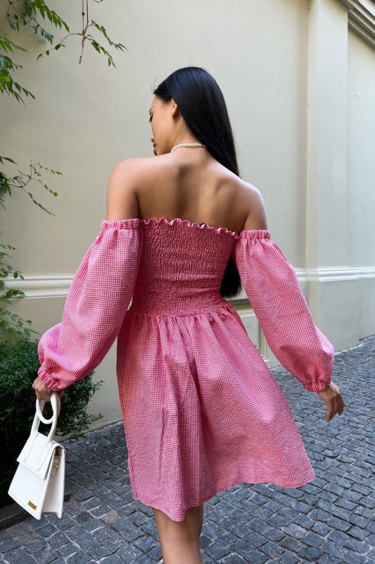 Мини-платье с завышенной талией, эластичным лифом и открытой линией плеч будет особенно актуально в жаркие дни. Легкая однотонная модель с рукавами-фонариками, сшитая из дышащего тонкого материала выполнена в яркой палитре летнего цвета.
