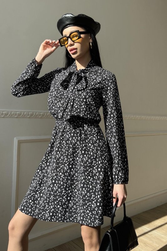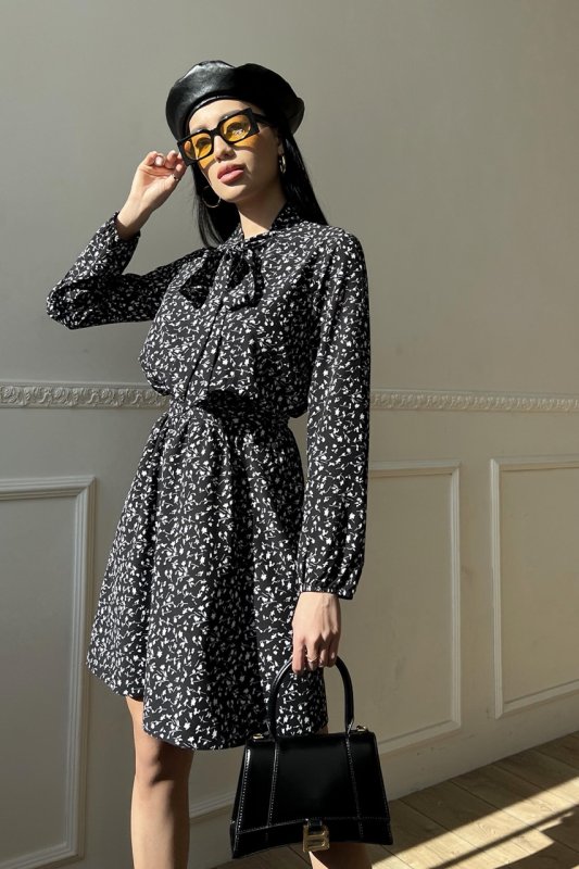 Свободный длинный рукав с эластичной манжетой, пояс в цвет платья, воротник-аскот с завязками, короткая юбка – помогут создать неповторимый образ на каждый день.