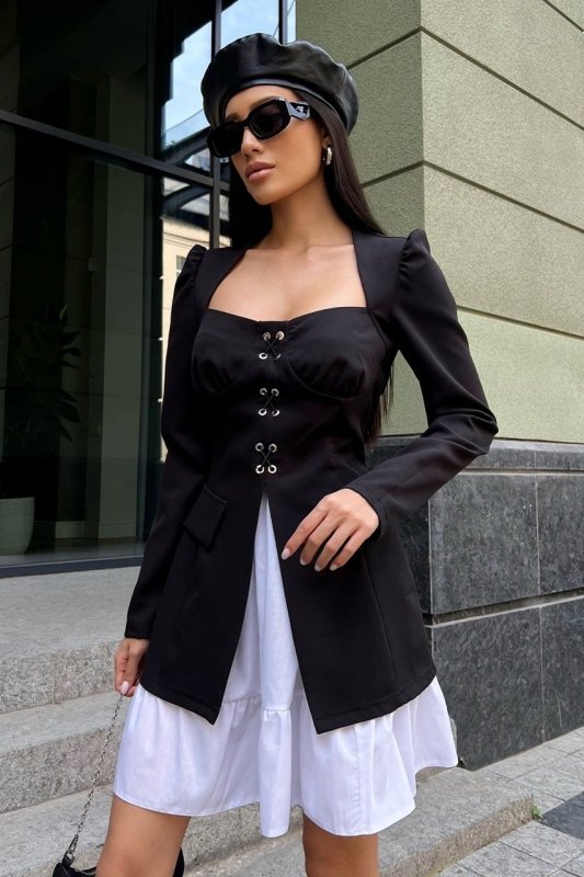 Смелое и сексуальное платье-двойка станет настоящим воплощением игривости и кокетства. Платье близлежащего силуэта с фигурным квадратным вырезом позволит продемонстрировать красивую линию декольте. Длина мини, зона декольте формируется благодаря формованной чашке и шнуровке впереди. К платью предусмотрена отдельная юбка – подюбник. Платье представлено в интересной комбинации черного с белым - станет отличным украшением праздника или платьем на каждый день.