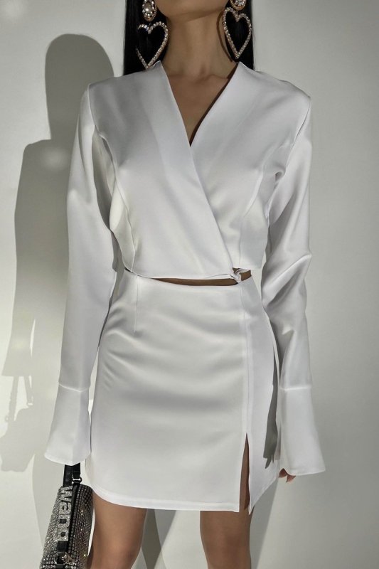 Необычная и интересная модель платья-костюма. Лиф на запах и короткая юбка с разрезом соединяются с помощью шнуровки. На юбке сзади – тайная молния. На юбке и лифе сделаны петельки, в которые протягивается шнуровка. Довершает образ длинный рукав с широким манжетом.
