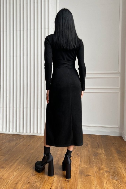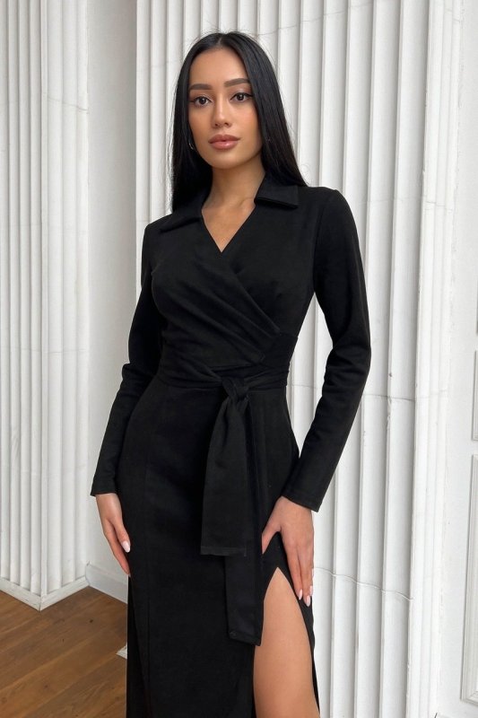 Стильное платье-миди выполнено из мягкого материала эко-замши. Модель стилизована составами на талии, помогающими сделать дополнительный акцент на женских изгибах фигуры. Лиф на запАх, пояс вшит. Рукав ¾, по ноге высокий разрез, по спинке предусмотрена молния для вашего комфорта.
