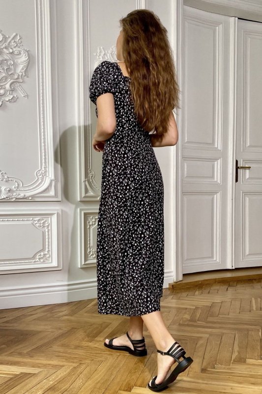 Новое платье – это сочетание женственного силуэта с нежным принтом мелких полевых цветов. Романтическое платье-миди прекрасно вписывается в тренды лета 2022. Изделие с лифом с кулиской дополнили широким акцентирующим поясом линию талии. На юбке сделан высокий разрез спереди. Короткие рукава драпируют эластичные элементы.