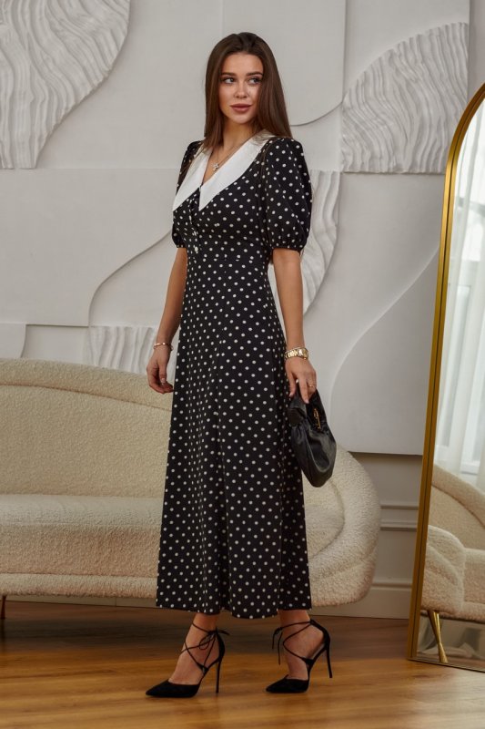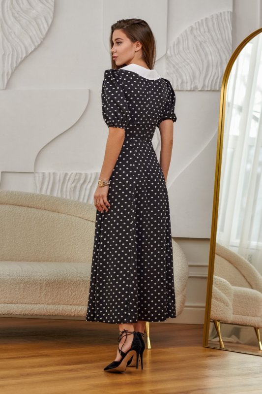Элегантное летнее платье макси из легкой черной ткани в белый горох – идеальный выбор для стильных женщин. Изысканный белый воротник и пышные короткие рукава придают образу шарма. Прекрасная линия декольте подчеркнет вашу женственность и привлечет внимание. Это платье создано для незабываемых впечатлений!