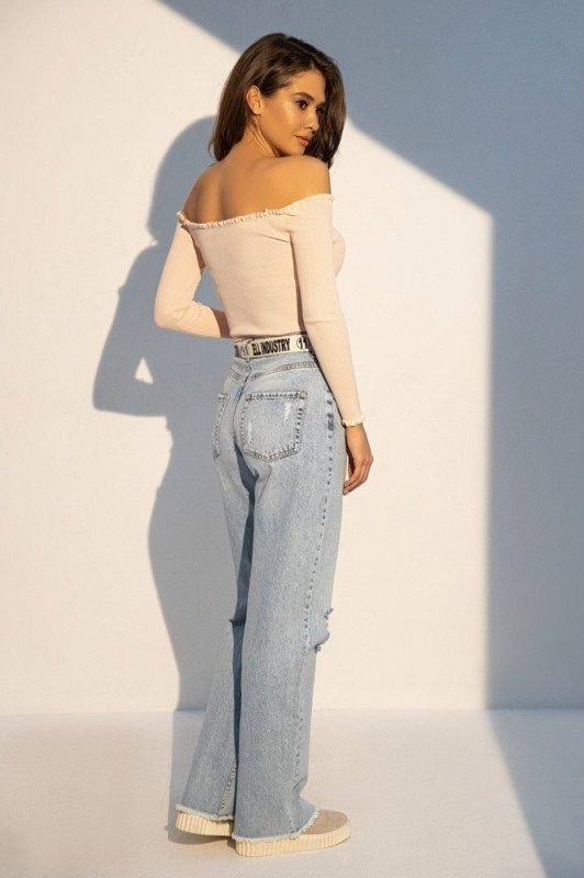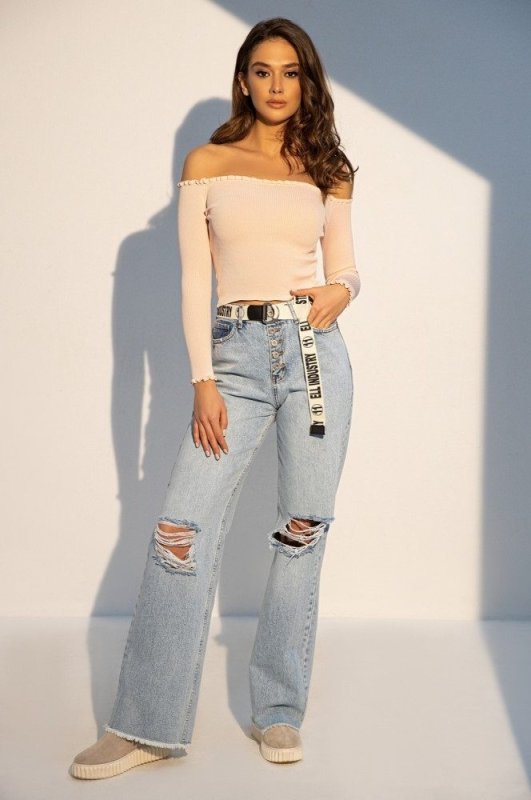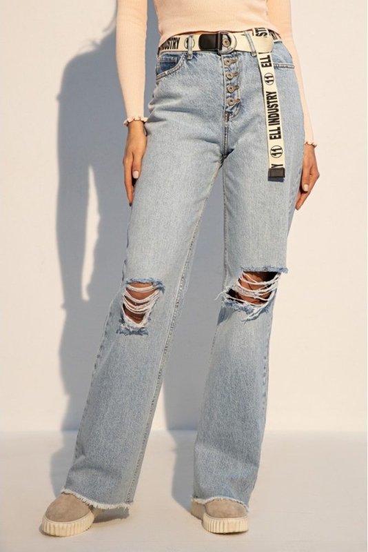 Прямые джинсы с декоративными дырками на коленях. Модель выполнена из светлого денима с высокой посадкой, подчеркивающая талию. Необработанный край брючин вносит легкую небрежность в образ. Ремень в комплекте. Джинсы - идеальное решение для создания комфортных ультрамодных луков. Произведено в Турции.