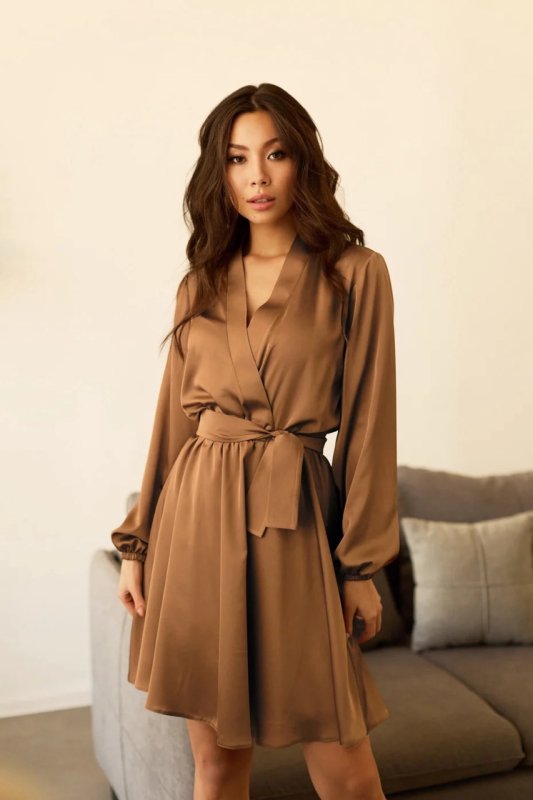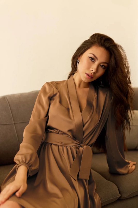 Пышное платье свободного кроя. Вырез горловины V-образный. Рукава длинные, пышные. Платье идет на запах. Пояс съёмный. Материал: шелк Армани.