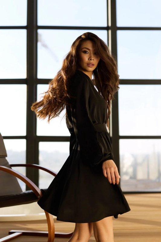 Пышное платье свободного кроя. Вырез горловины V-образный. Рукава длинные, пышные. Платье идет на запах. Пояс съёмный. Материал: шелк Армани.