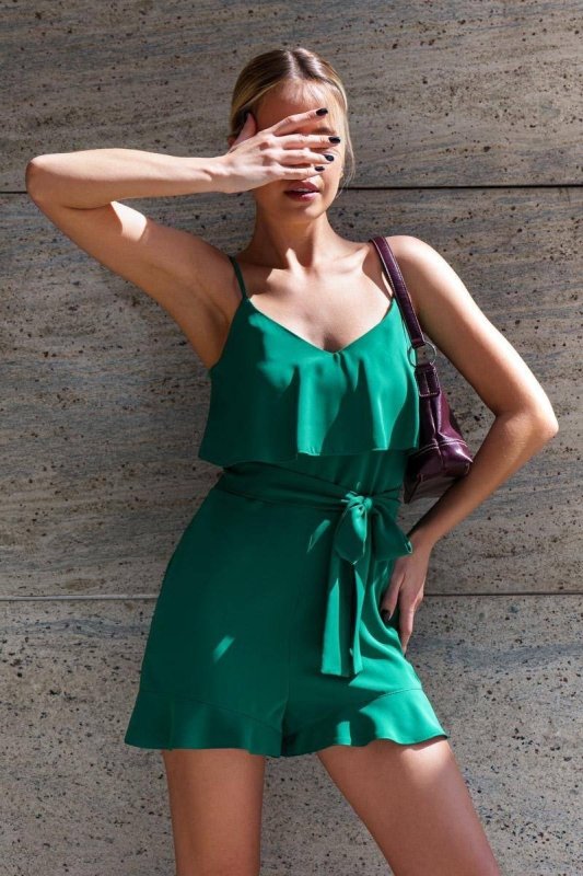 Романтический Ромпер из шелковистой костюмной ткани на тонких регулируемых бретелях, украшенный широким воланом, шорты с боковыми карманами и рюшами по низу. Пояс в комплекте. Застёгивается на тайную молнию сзади.