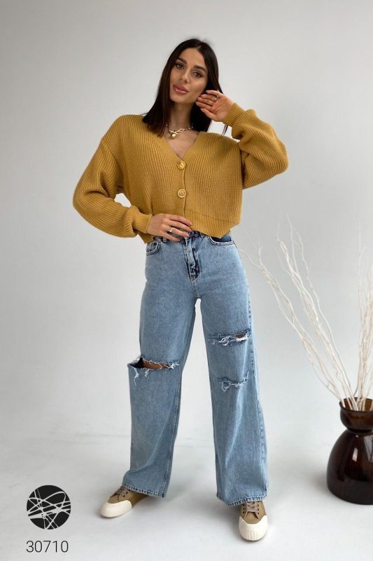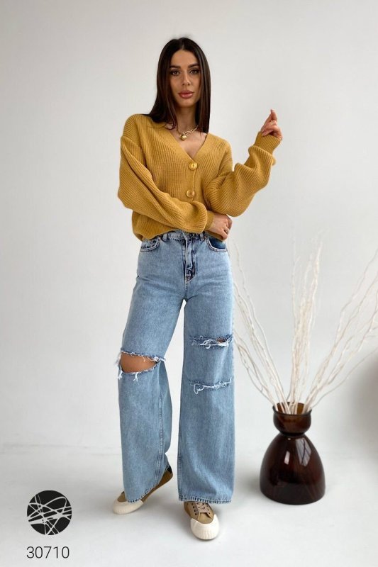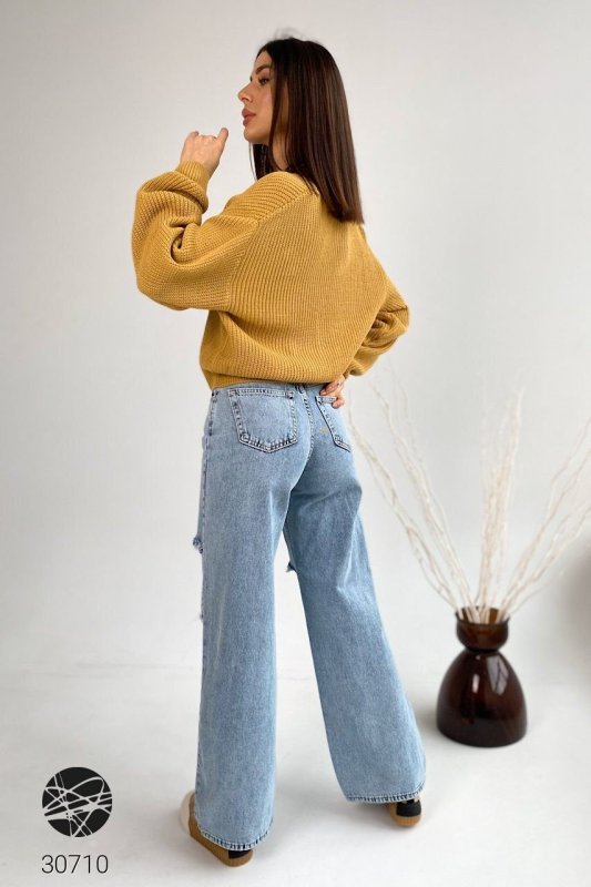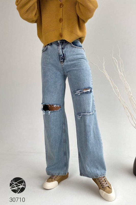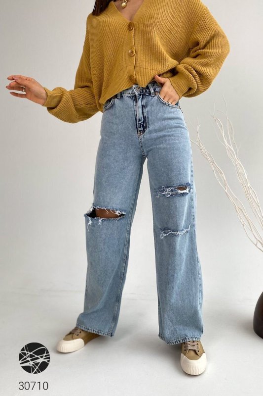 Джинсы из плотного качественного коттона, производства Турции. Завышенная талия, шлёвки, боковые прорезные карманы и накладные карманы сзади. Скрытая ширинка с застёжкой на молнию и пуговицу, разрезы с необработанными краями. Состав ткани: 100% - коттон.