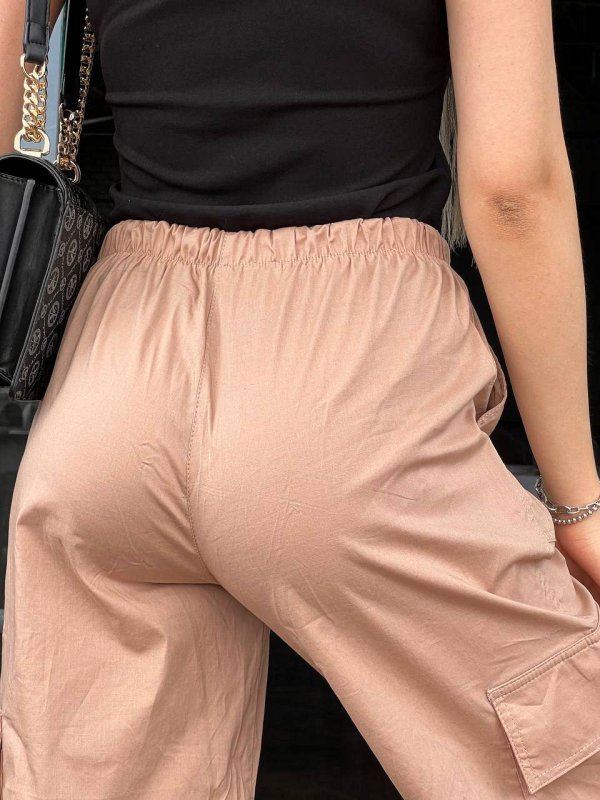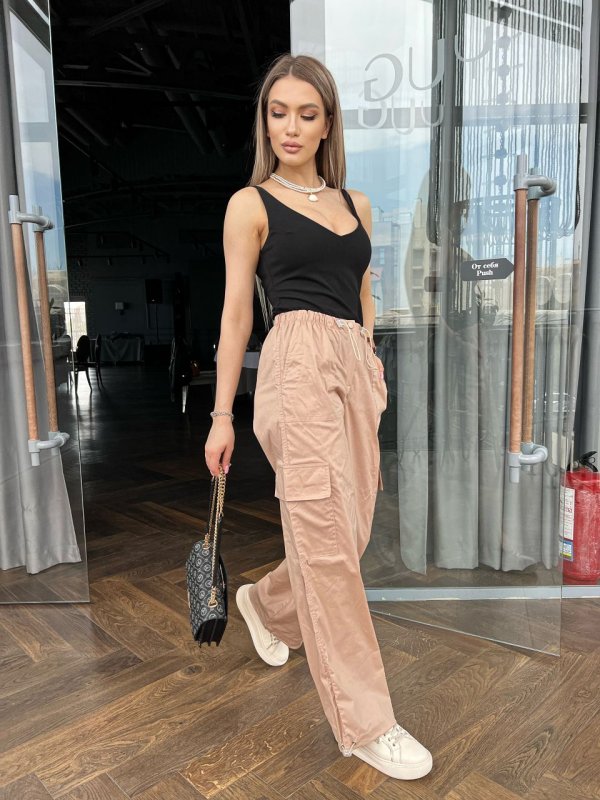 Штаны карго свободные. Имеют регулируемые резинки на поясе и внизу, а также молнию с пуговицей. Все карманы активны. Выполнены из натуральной летней ткани.