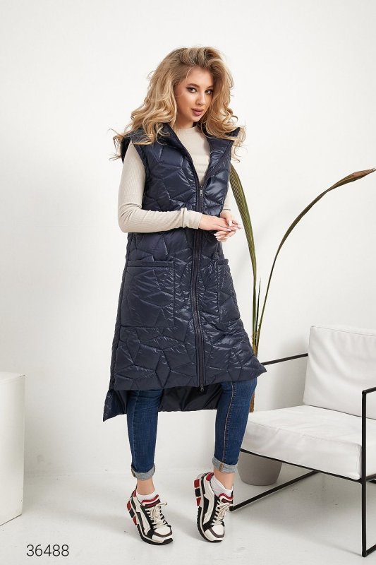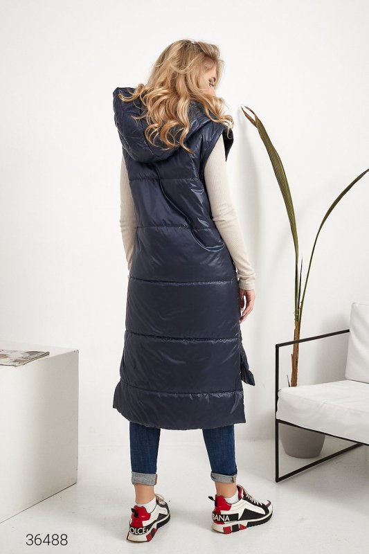 Жилет из качественной плащевой ткани на синтепоне. Объёмный капюшон, боковые накладные карманы, асимметричный нижний край с боковыми разрезами. Есть подкладка с контрастным принтом, застёжка на молнию.
