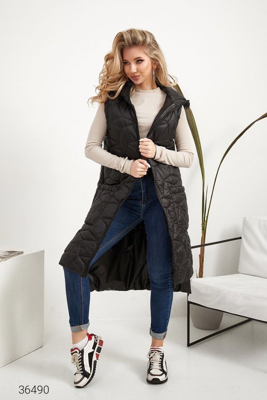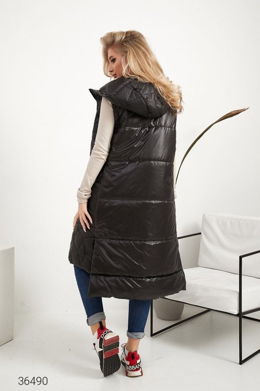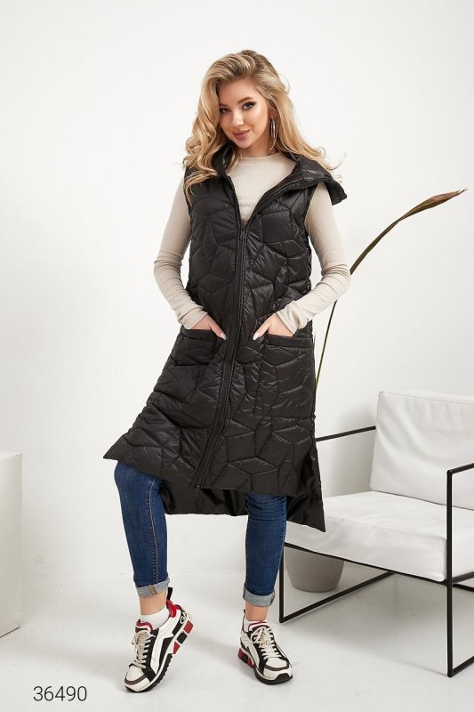 Жилет из качественной плащевой ткани на синтепоне. Объёмный капюшон, боковые накладные карманы, асимметричный нижний край с боковыми разрезами. Есть подкладка с контрастным принтом, застёжка на молнию.