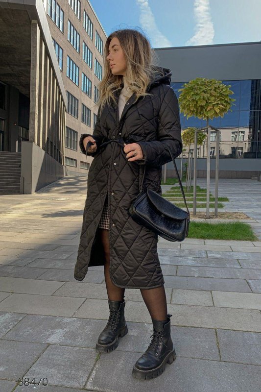 Стёганое пальто с капюшоном. Пальто из стёганной плащёвой ткани на силиконе. Объёмный капюшон, боковые прорезные карманы, затягивающийся шнурок на талии. Есть подкладка, планка на кнопках.