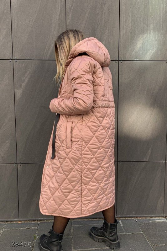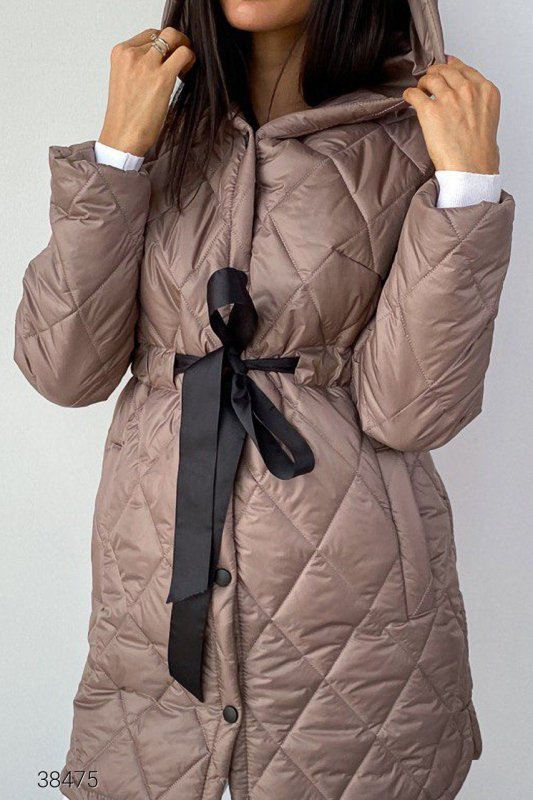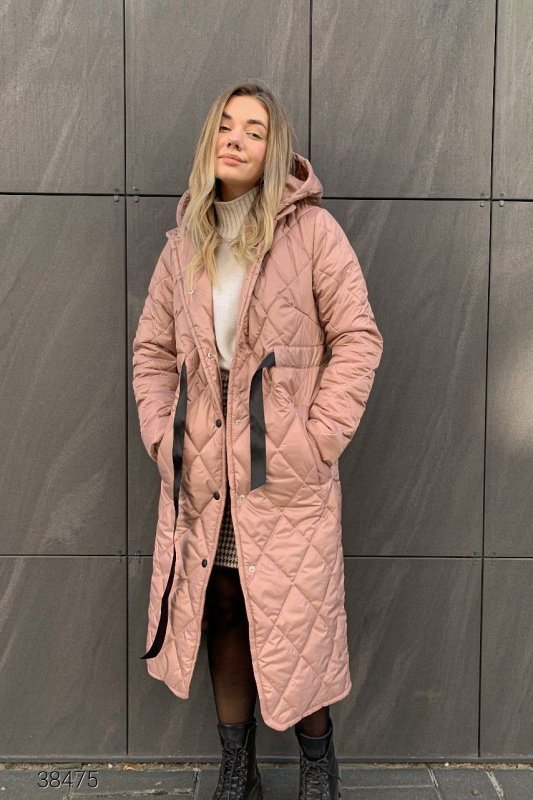 Стёганое пальто с капюшоном. Пальто из стёганной плащёвой ткани на силиконе. Объёмный капюшон, боковые прорезные карманы, затягивающийся шнурок на талии. Есть подкладка, планка на кнопках.