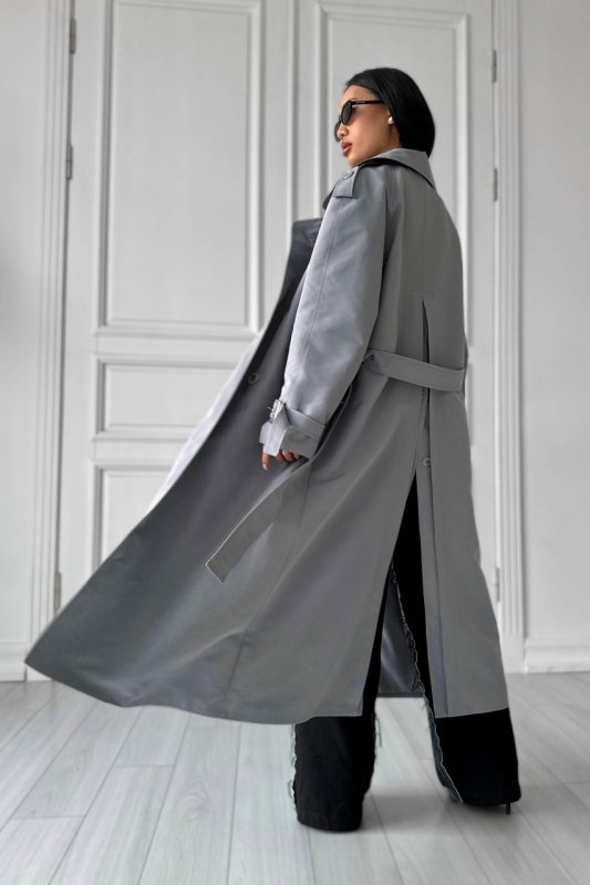 Двухбортный тренч на подкладке, застегивается на пуговицы в тон, по спинке щелка в разрезе, застегивающаяся на пуговицы.