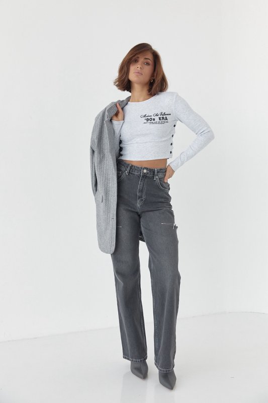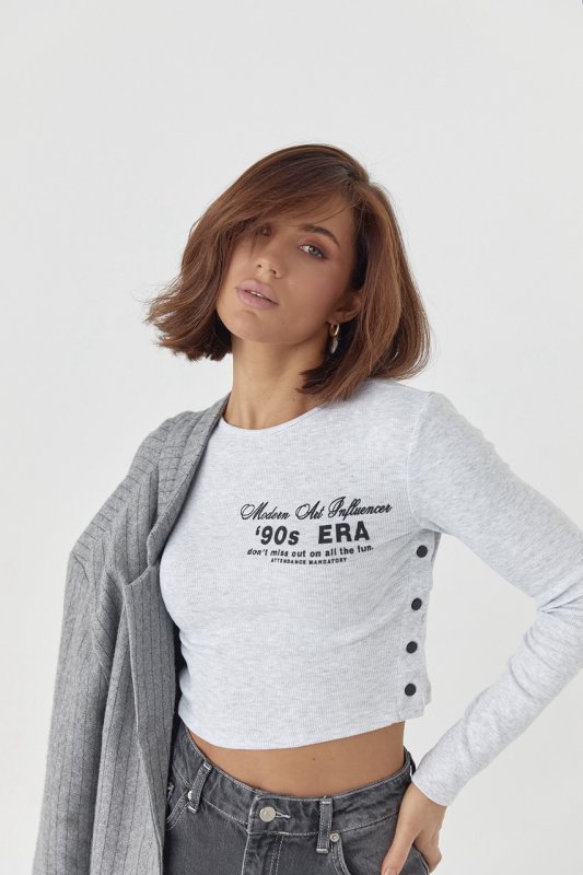 Круглая горловина обшита окантовкой и спереди, на груди, кофточка украшена буквенным принтом. Боковые швы в изделии застегивается на кнопки.