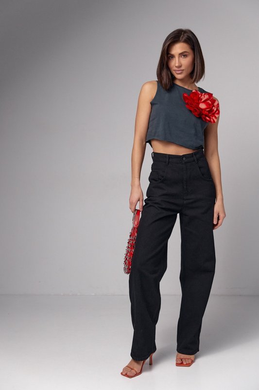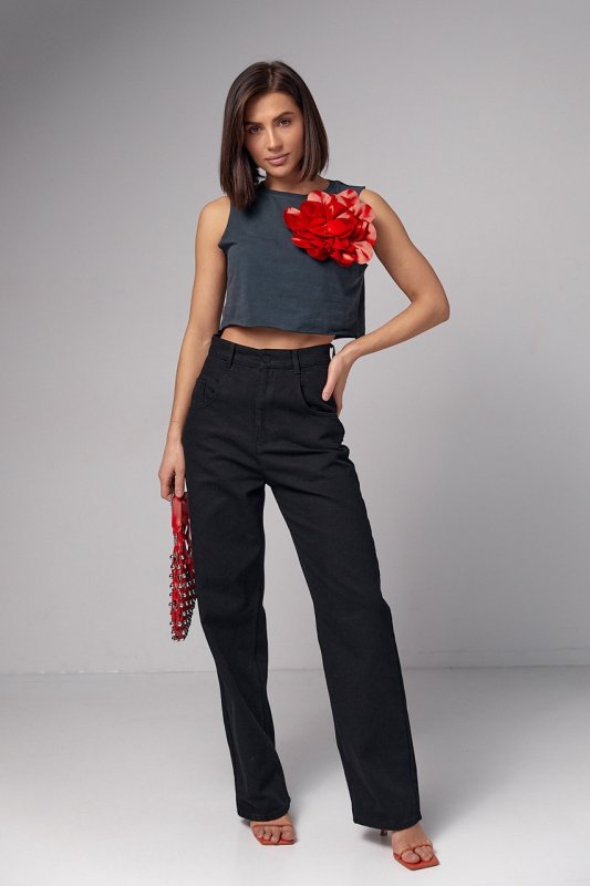 Трикотажная майка-топ с объемным цветком - 12369 темно-серый