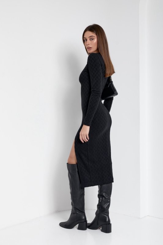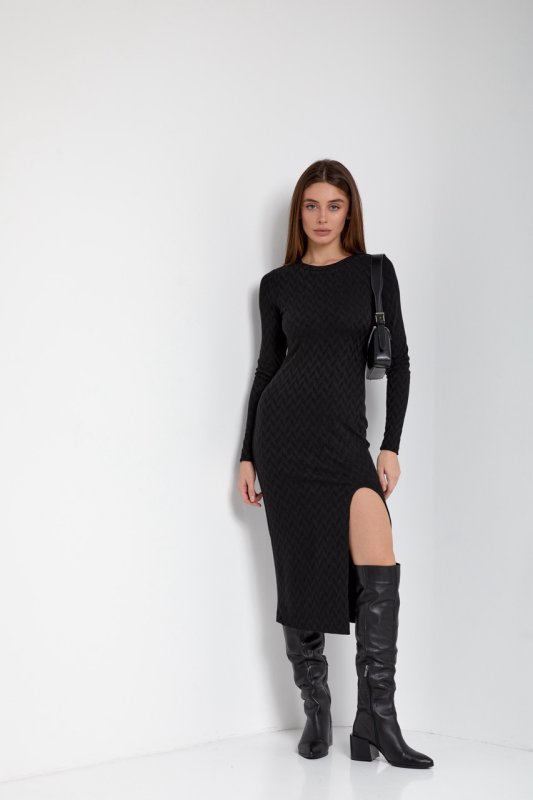 Трикотажное обтягивающее платье длиной миди с высоким разрезом на левой ноге. Вырез горловины круглый, с планочкой. Рукава вшивные, длинные. Спинка со средним швом и выточками.