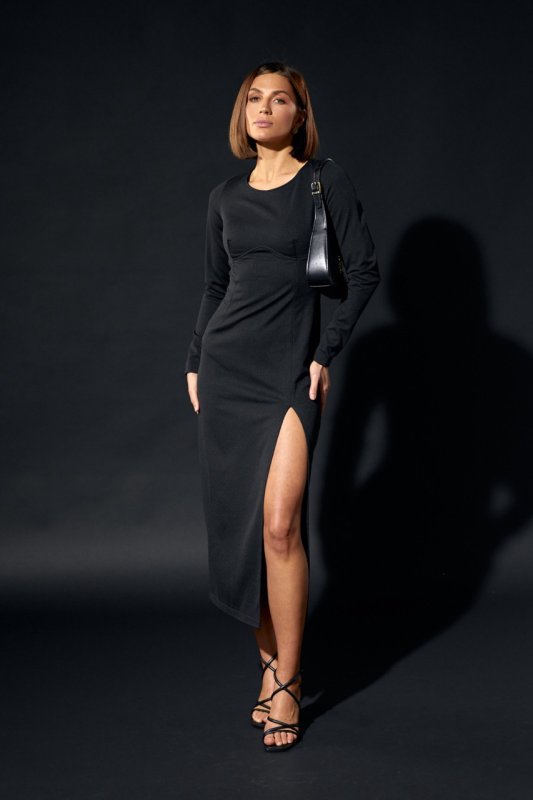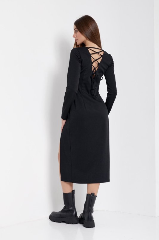 Трикотажное платье миди с разрезом на левой ноге. Вырез горловины спереди круглый, а на спинке V – образный со шнуровкой. Лиф отрезной под грудью, притален выточкой, слева снизу шов и разрез. Спинка со средним швом и выточками. Рукава вшивные, длинные.