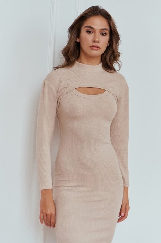 Трикотажное платье-двойка длины миди. В комплект входит платье и топ с длинным рукавом. Универсальное платье, которое можно одевать в любой период года. Изюминка модели – оригинальный вырез "капля" на груди. Он маняще оголяет зону декольте, придает образу соблазнительности. Без застежек.