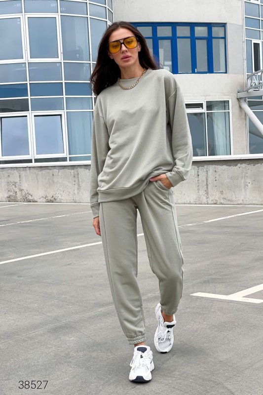 Трикотажный костюм из свитшота и джоггеров. Ткань - качественная турецкая трехнить петля. Свитшот с заниженной линией плеч. Джоггеры с поясом на резинке, боковые прорезные карманы, манжет резинка. Размер универсальный, подходит на 42-48.