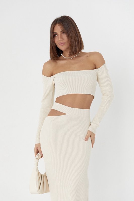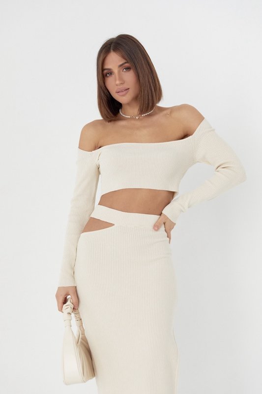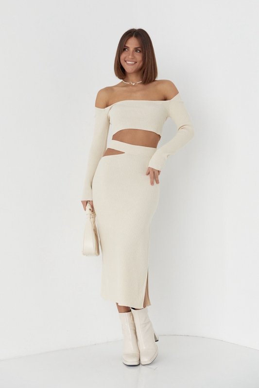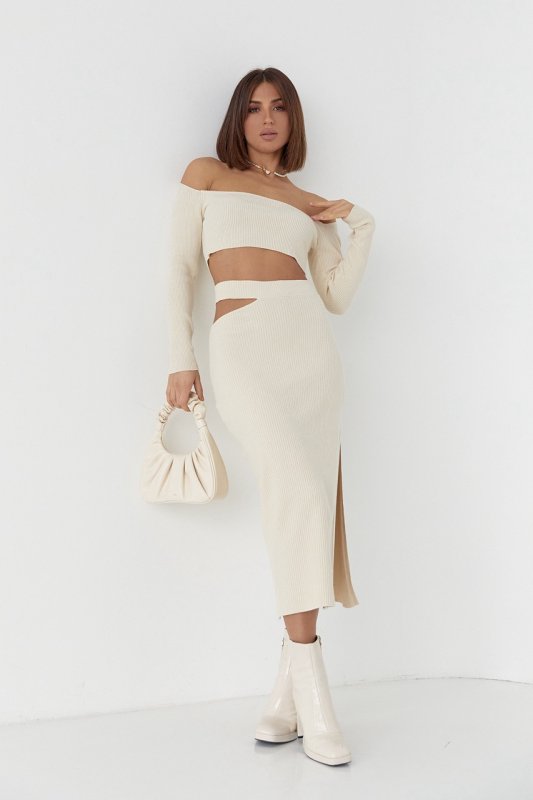 Укороченная кофточка в рубчик с квадратной горловиной, подчеркнет вашу женственность, а приталенная юбка длинны миди, идеально фиксируется на талии благодаря эффектному поясу-резинке. Приятная к телу ткань – плотный трикотаж с эластичным эффектом, придаст вам комфорт и согреет в прохладный день.