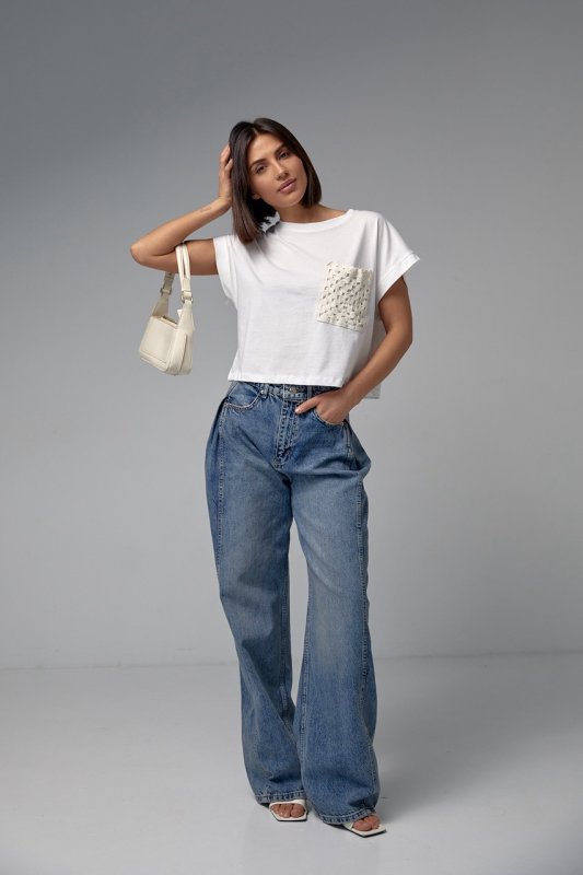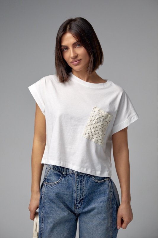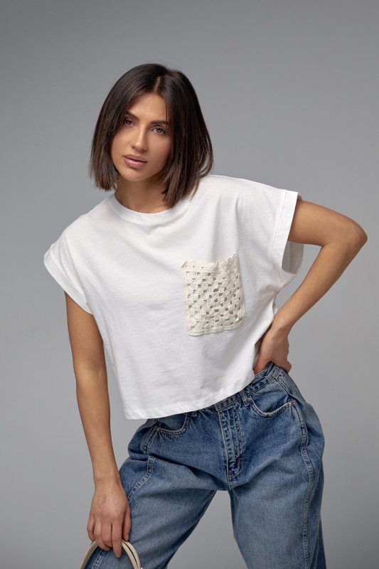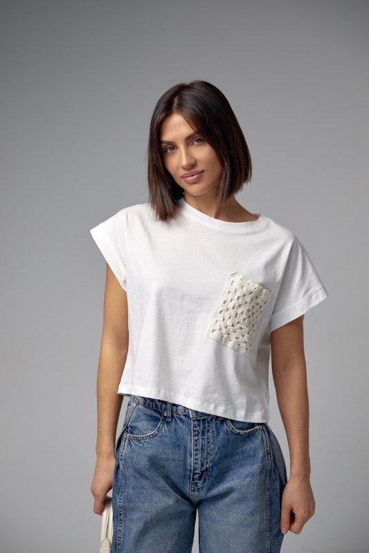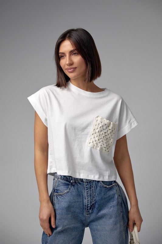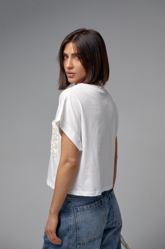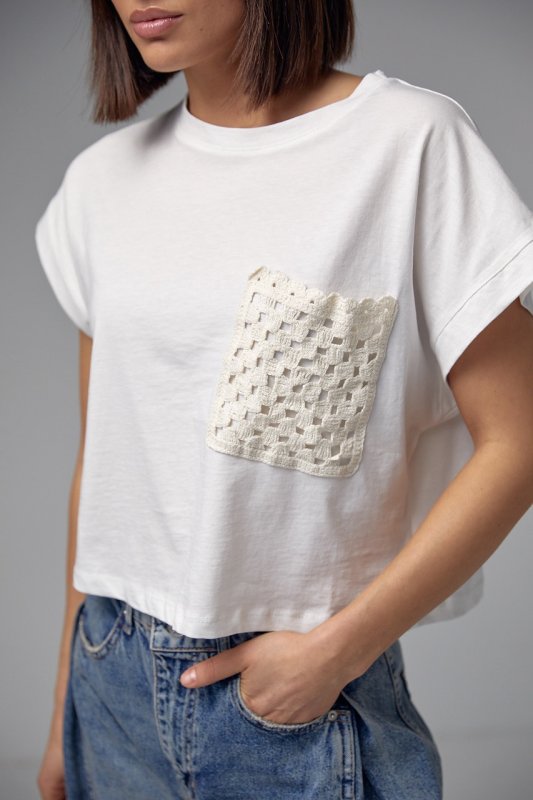 Укороченная футболка с ажурным карманом - 08756 молочный