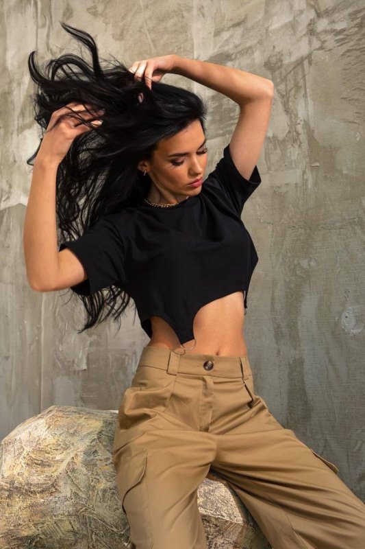 Модная укороченная футболка свободного кроя с имитацией подтяжек. Стильная и очень комфортная вещь, сочетающаяся любым стилем одежды.