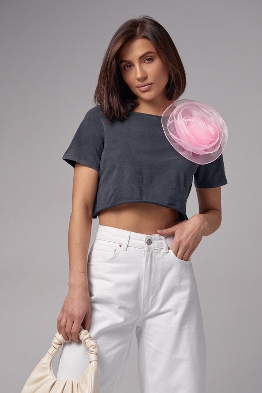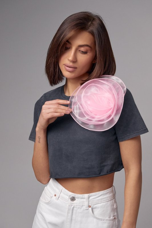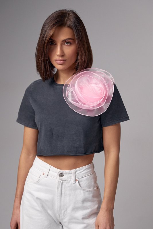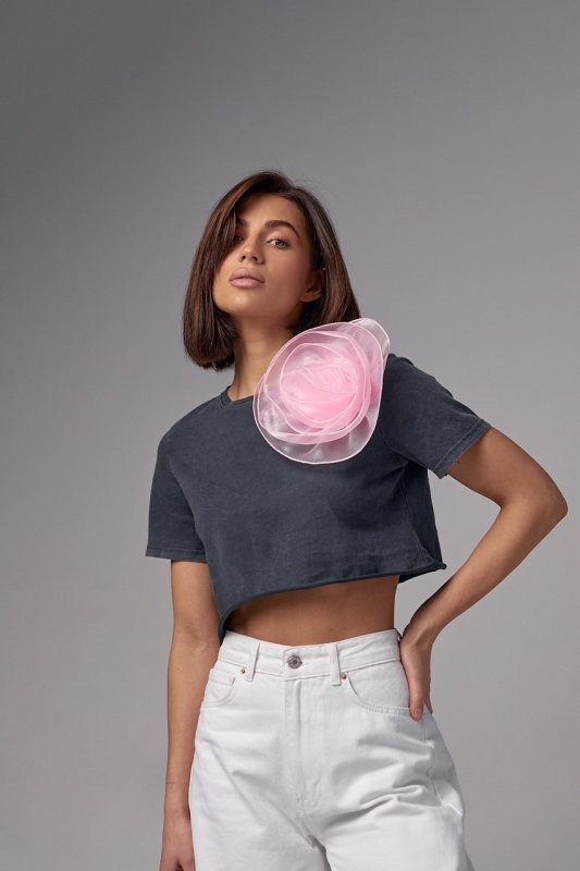Укороченная футболка из трикотажа с необработанным низом – это стильный элемент гардероба, который привлекает внимание своей оригинальностью. Спереди она украшена объемным цветком, который придает изделию изящный вид и делает его неповторимым.