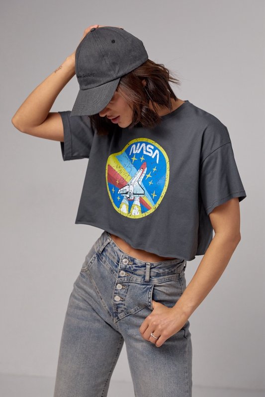 Укороченная женская футболка с принтом Nasa - 1259 темно-серый