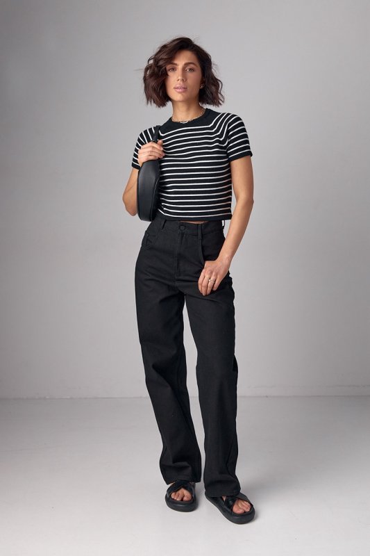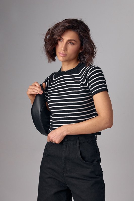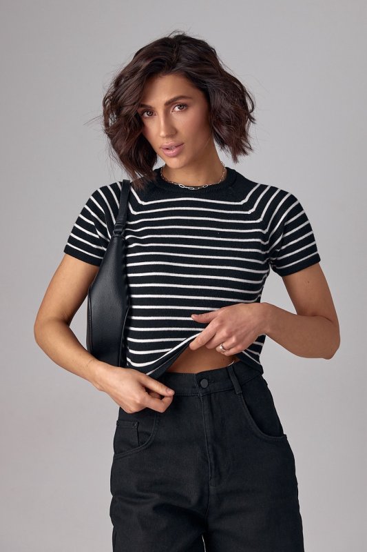 Эта модель подчеркивает красоту женской фигуры благодаря укороченному фасону и расставляет финальные акценты благодаря узким горизонтальным полоскам контрастного цвета. В изделии края низа прямые, рукава-регланы короткие, а круглая горловина обшита однотонной бейкой в цвет фона.