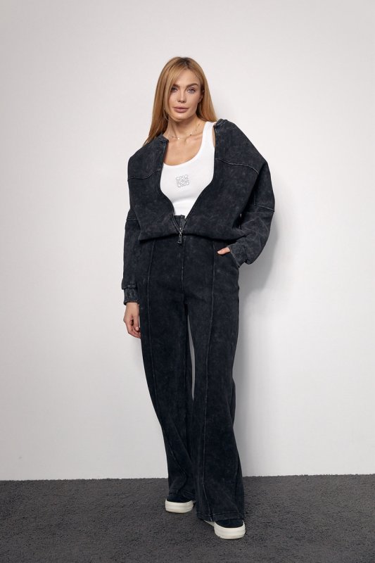В кофте манжеты на рукавах и воротник-стойка на круглой горловине выполнены из рибаны в мелкий рубчик, а низ изделия дополнен трикотажным манжетом. Вверху изделия спереди и сзади расположены декоративные швы. Застегивается бомбер на металлическую молнию.