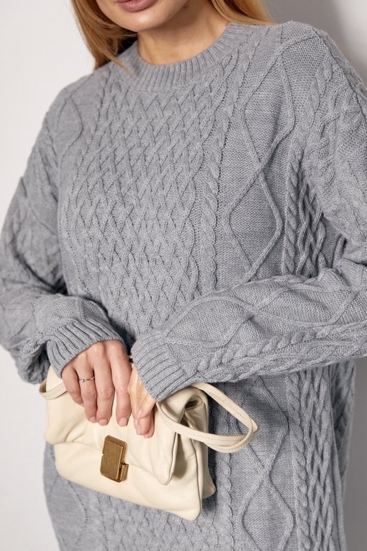 Эта модель выполнена из платочной вязки и украшена узорами из крупных кос и ромбов. Круглый воротник, манжеты прямого низа и длинных рукавов выполнены из вязки в широкий рубчик. Линия плеча удлиненная.