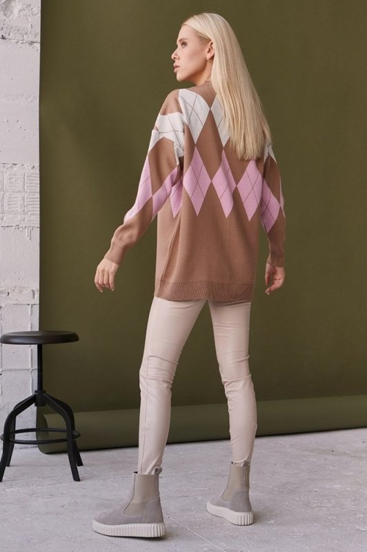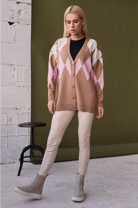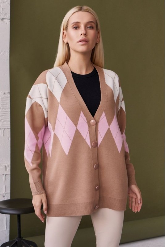 Удлиненный кардиган в узор "Ромб" со спущеной линией плечевого шва. Застегивается на пуговицы. Его можно носить в любой период года и комбинировать с разными вещами. Удобный и функциональный. Произведено в Турции.