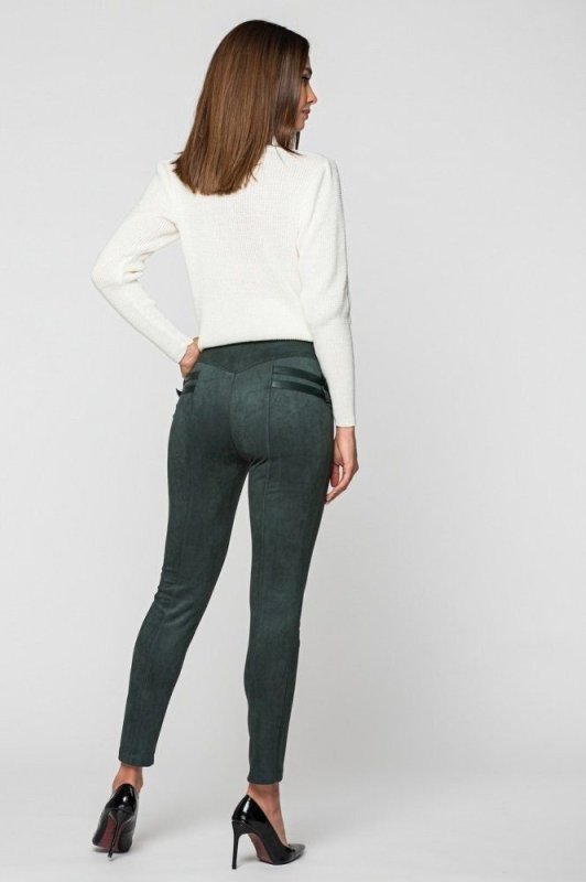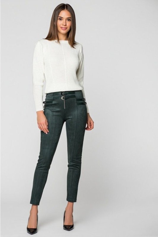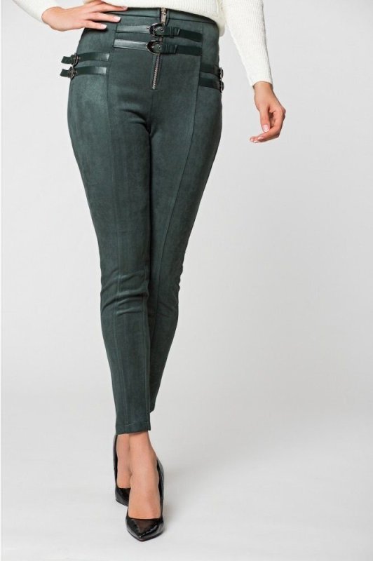 Зауженные замшевые брюки высокой посадки, с функциональной металлической молнией спереди и декором из кожаных ремней.