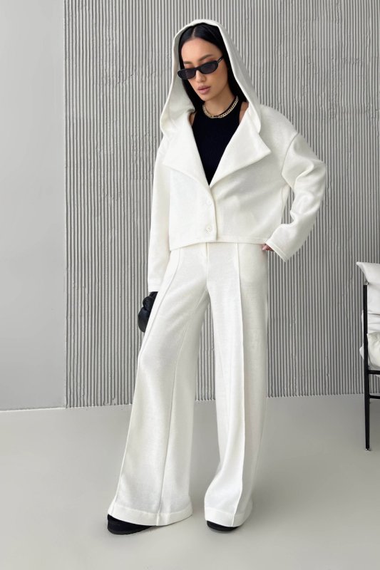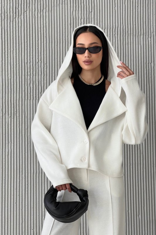 Жакет однобортный свободного кроя, с капюшоном. Длинный рукав со спушенным плечом. Отложной воротник с острыми лацканами переходит в капюшон. Застегивается на пуговицы, на внутренней части жакета – съемная диталь под пуговицы.