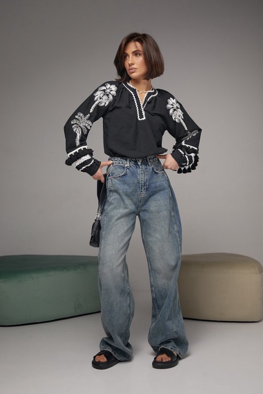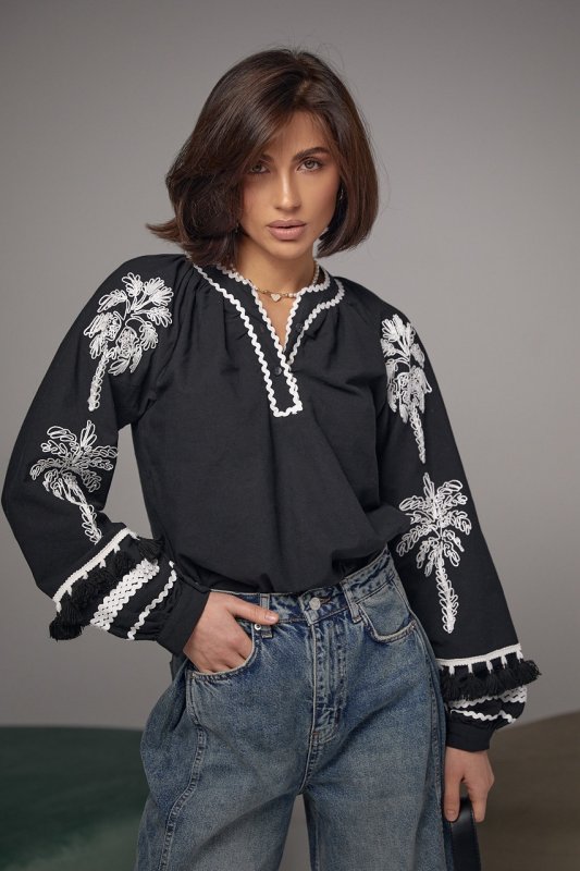 В модели длинные рукава-регланы украшены аппликацией в виде пальм и собраны на манжет с пуговичкой. Внизу рукавчики украшены волнистой тесьмой и кистьями. Такая ж тесьма присутствует у на горловине, которая переходит в короткую планку с застежками-пуговичами. Низ блузы прямой.