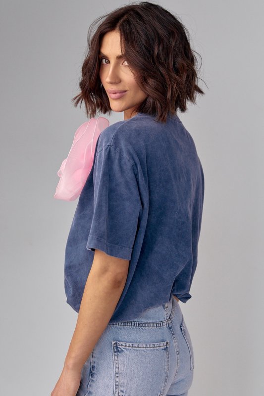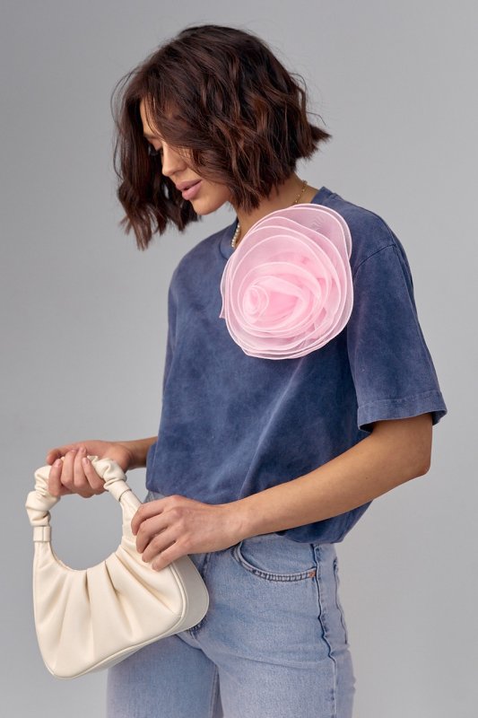 На передней части футболки, слева, расположена объемный цветок. Этот изысканный и нежный элемент придает футболке особый шарм и женственность.