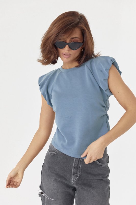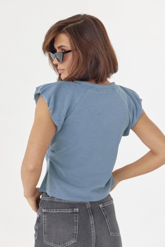 Модель имеет полуприталенный фасон. Горловина круглая, дополнена окантовкой. Короткие рукава-регланы имеют пышную форму за счет подкладки, которая формирует фонарик. Низ изделия на спинке прямой, спереди - асимметричный.