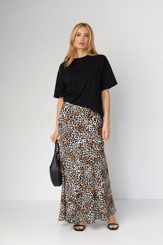 С такой модной футболкой, украшенной стразами, можно смело носить и молодежные джинсы, и строгие лаконичные брюки. Это одна из тех вещей, декор которой подходит под разные стили в одежде.