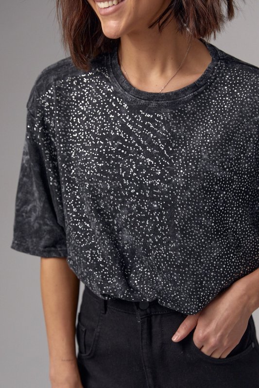 Женская футболка свободного кроя, изготовленная из трикотажа в технике тай-дай и полностью украшенная термостразами, является проявлением стиля и оригинальности.