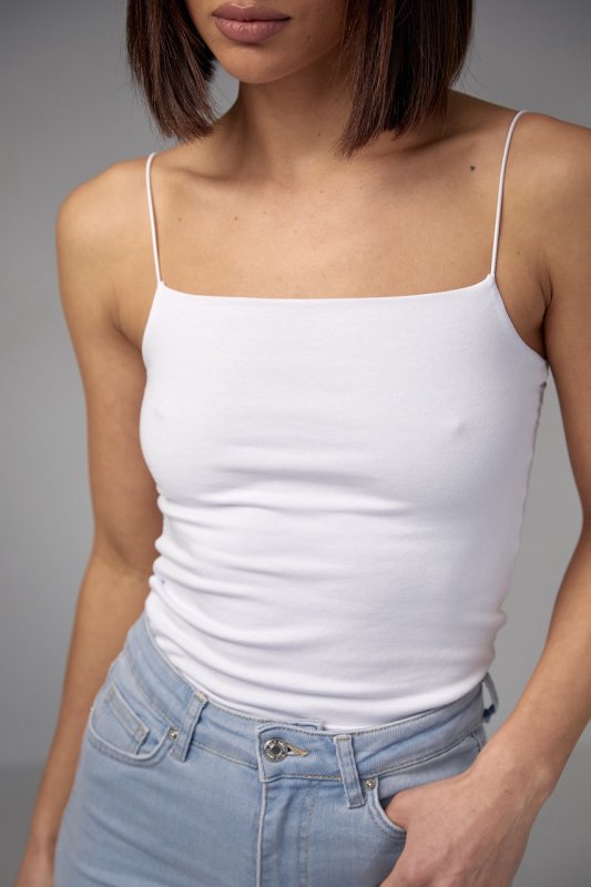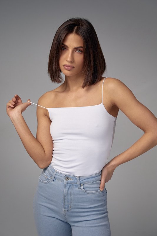 Модель на тонких бретелях-резинках без регулировки длины сшита из трикотажа, с прямым низом и с дополнительной подкладкой спереди изделия.