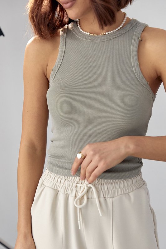 Женская майка в рубчик с рваным декором - 4551 хаки