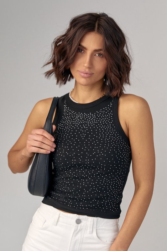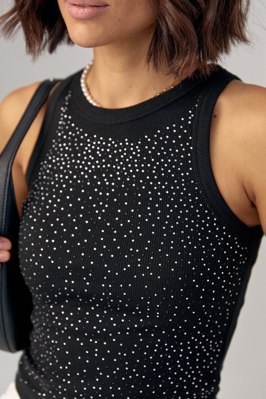 Женская майка в рубчик украшена термостразами - 03262 черная