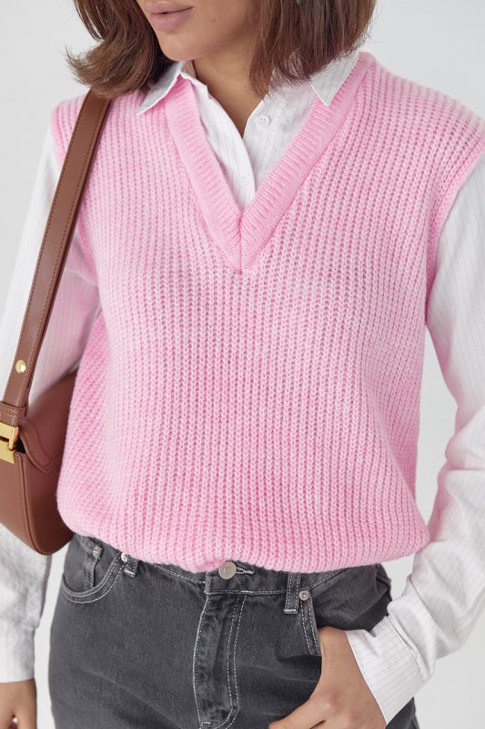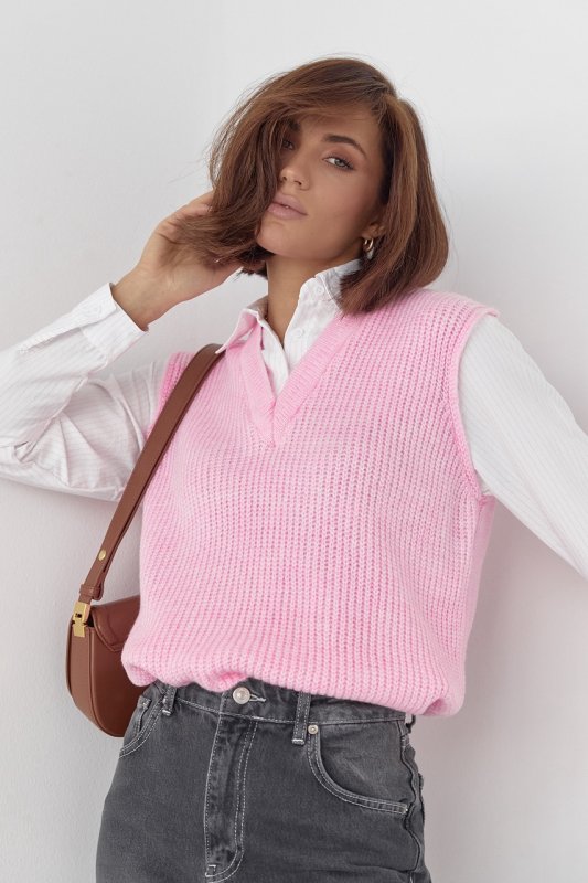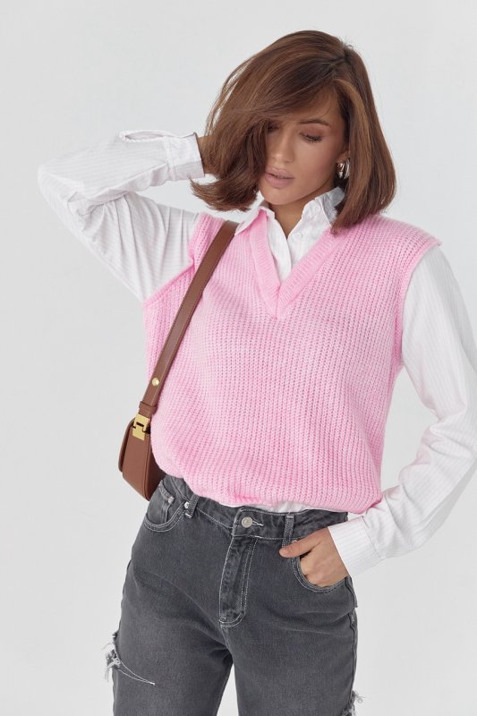 Наша новинка имеет хлопковую рубашку с классическим воротником на стойке и длинными рукавами с манжетами на пуговичке. Жилет выполнен в технике английской вязки, вшит в рубашку и имеет V-образкую горловину.
