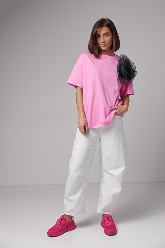 Базовая женская футболка и оригинальный акцент в виде объемного цветка - идеальный тандем для стильного образа. Эта модель легко преобразит ваш образ и сделает его элегантным и привлекательным.