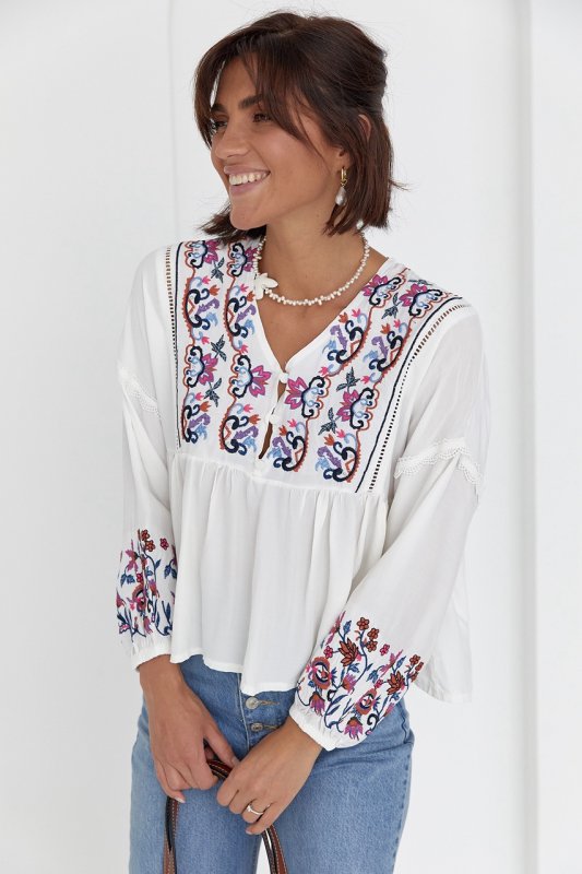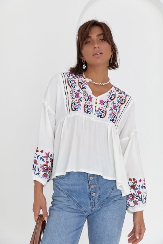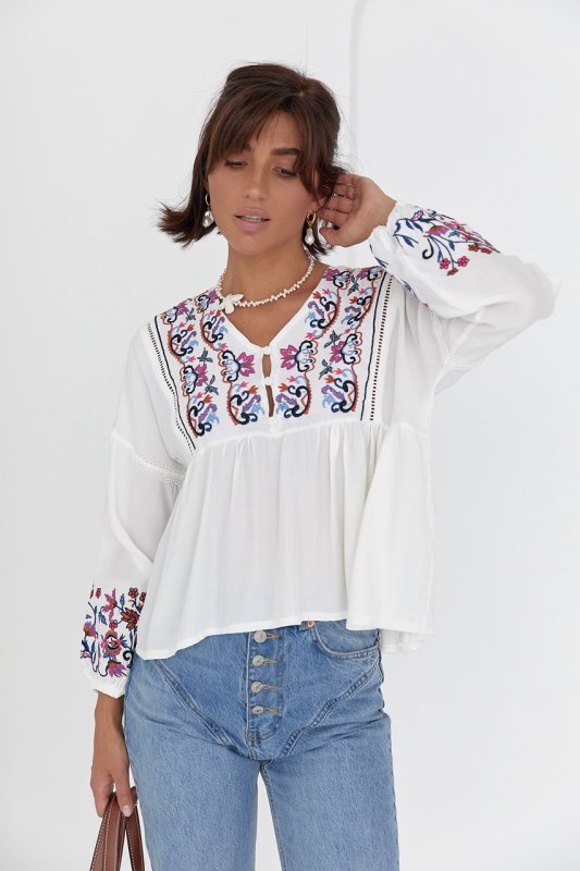 Низ рукавчиков собран на узкую резинку. V-образная горловина, дополнена спереди разрезом и планкой с пуговичками. Под грудью есть шов, который собирает низ вышиванки в мелкие складки. Основная часть рукава и планка спереди украшены вышивкой гладью.