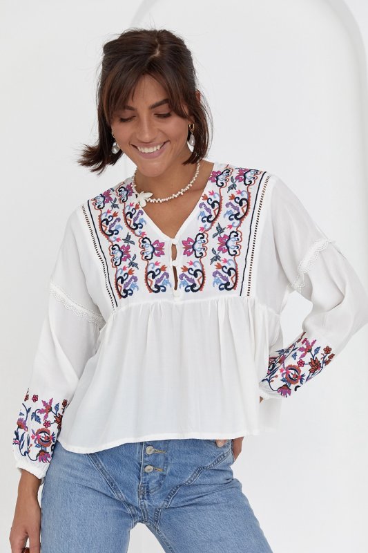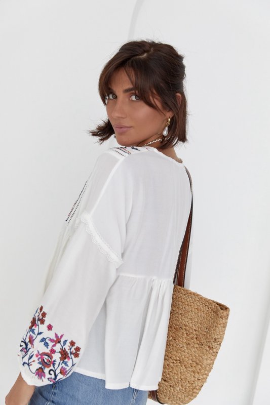 Женская вышиванка с вышивкой гладью и кружевом - 1103 молочный