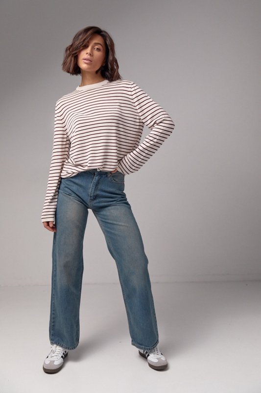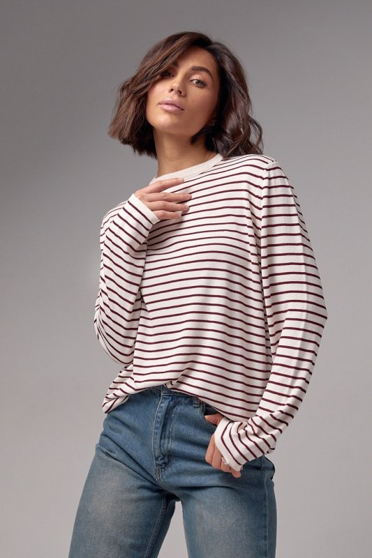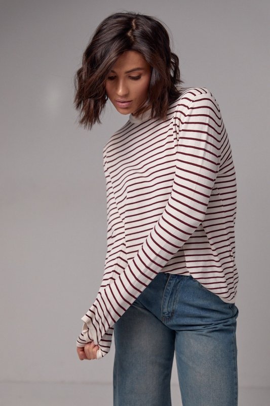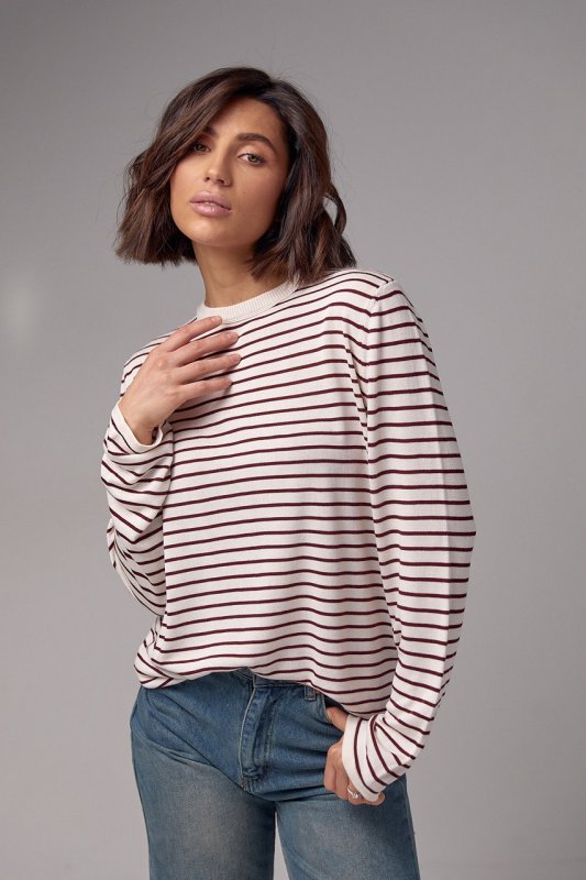 С таким полосатым модным джемпером из машинной вязки твои будни будут стильными и уютными. Такая вещь подружится и с брючными изделиями, и с красивыми юбками.