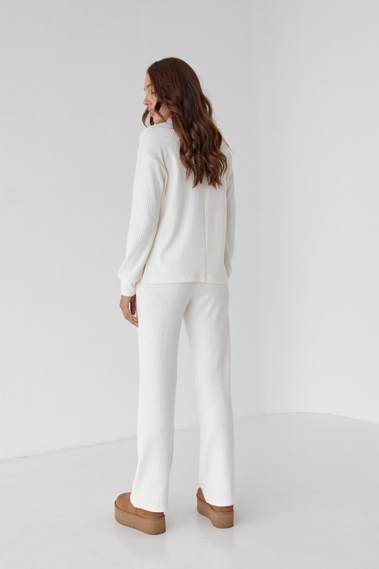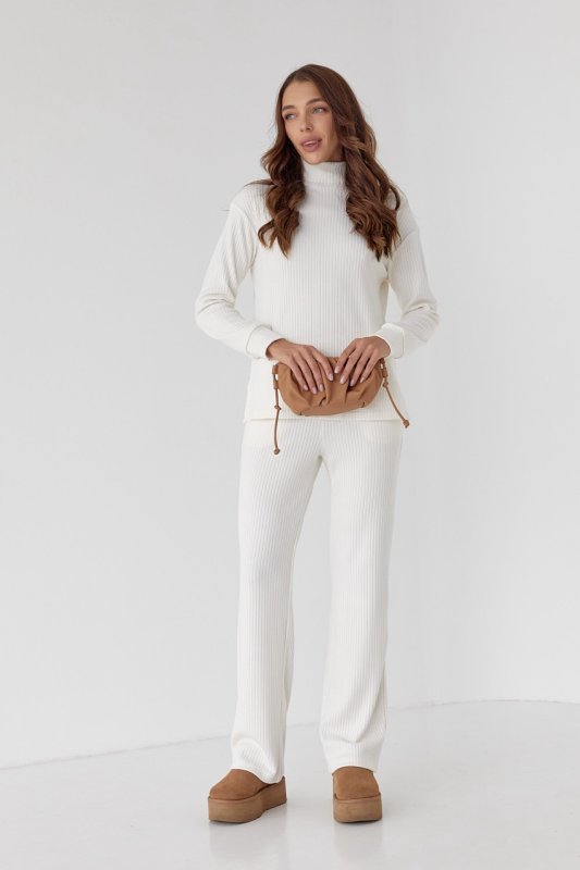 Женский костюм прямые брюки и свитер. Свитер длиной до линии бедер, по низу распорки. Уровень плеча приспущен, рукава втачные, длинные, по низу манжеты. Спинка со средним швом. Вырез горловины круглый, воротник стойка. По низу свитера проложена строчка. Брюки прямые, длинные, на талии пояс с резинкой. Карманы с отрезным бочком. По низу штанишек и на поясе проложены строчки.