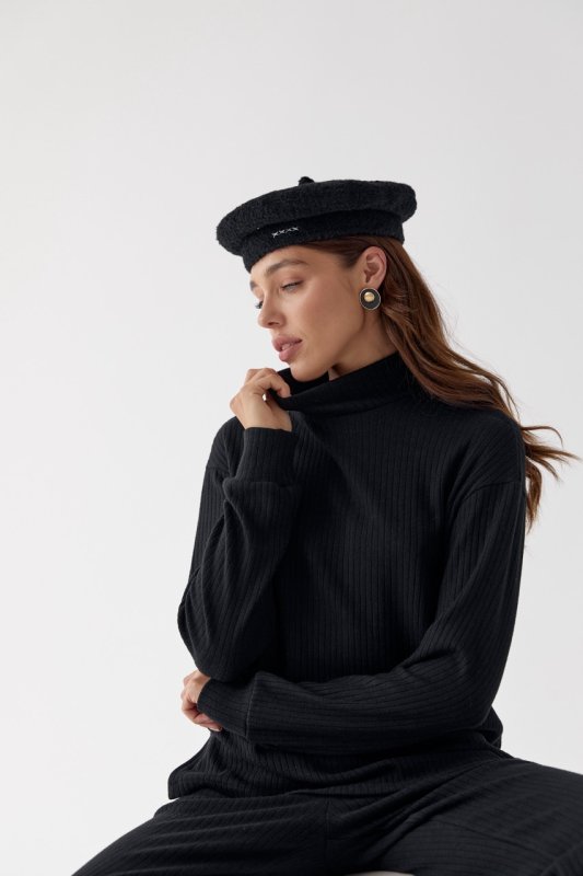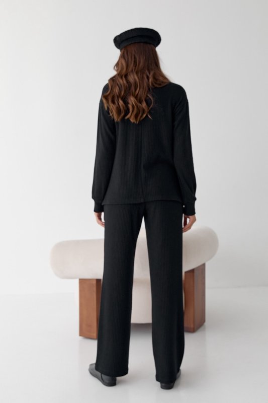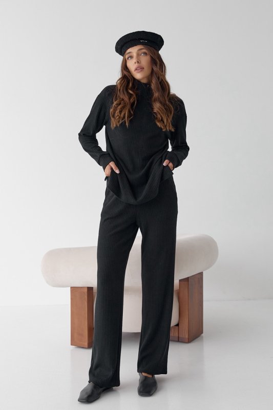 Женский костюм прямые брюки и свитер. Свитер длиной до линии бедер, по низу распорки. Уровень плеча приспущен, рукава втачные, длинные, по низу манжеты. Спинка со средним швом. Вырез горловины круглый, воротник стойка. По низу свитера проложена строчка. Брюки прямые, длинные, на талии пояс с резинкой. Карманы с отрезным бочком. По низу штанишек и на поясе проложены строчки.